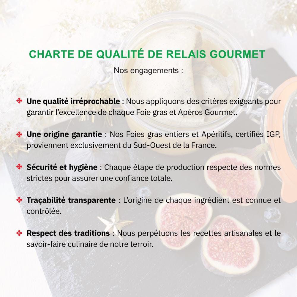 A true artisanal Foie Gras is recognizable by its simplicity: foie gras, salt, pepper—nothing more. Choose a whole Foie Gras, French and preferably from the Southwest, with its golden color and melting texture. At Relais Gourmet, all our Foie Gras are guaranteed to be free of preservatives, additives, and colorings, to rediscover the taste of the real thing.